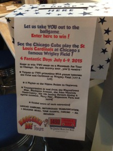 Again, make sure to tune into 1490 AM to learn how to enter your name to win 2 seats on our Cubs and Cards Baseball Tour, July 6-9, 2015!